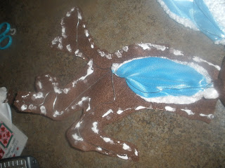 Here is where I wasn't sure what to do. I thought about sewing the felt but then I wasn't sure how to slip them on the ears. So, Instead I decided on craft glue. I put one piece under the ears and taped the wires to the felt and then took small pieces of newspaper to stuff the ears. I then glued all the way around... but then the glue wasn't working by the time I got to another section. So what you need to do is lay the other piece on top and then gradually work yourself around the edges. Gluing and pressing till it holds and then move on.